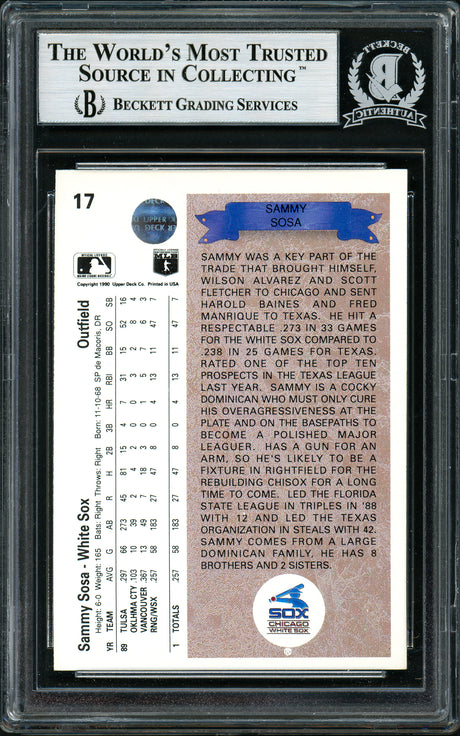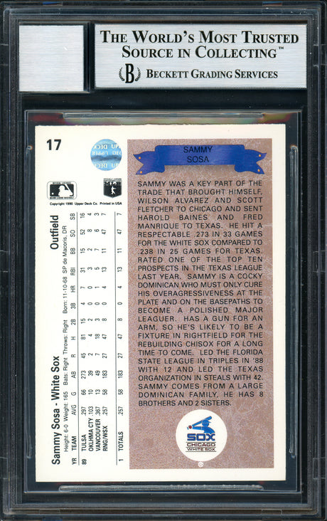 Sammy Sosa Autographed 1990 Upper Deck Rookie Card #17 Chicago White Sox Beckett BAS Stock #177679