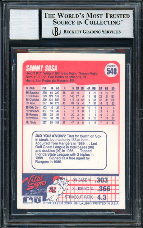 Sammy Sosa Autographed 1990 Donruss Rookie Card #489 Chicago White Sox Beckett BAS Stock #177671