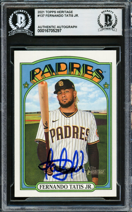 Very low stock (1 unit)$99Unit price /UnavailableFernando Tatis Jr. Autographed 2021 Topps Heritage Card #137 San Diego Padres Beckett BAS #16705297
