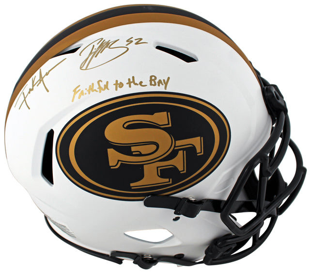 This San Francisco 49ers Lunar Alternate Full Size Speed Proline Helmet is a must-have for any die-hard Niners fan. Personally signed by Patrick Willis and Frank Gore, this exclusive collectible captures the legacy of two legends who helped define the 49ers’ dominant era. Adding a rare touch, Willis inscribed "Faithful To The Bay" alongside his signature, making this item even more special. Key Features: