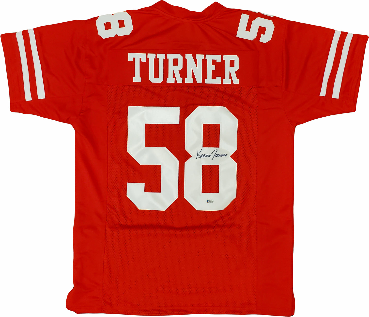 This San Francisco 49ers red jersey is a prized collectible, hand-signed by legendary linebacker Keena Turner. A key defensive force during the 49ers' dynasty years, Turner helped secure four Super Bowl championships, cementing his place in franchise history. This autographed jersey is the perfect addition for any dedicated 49ers fan or memorabilia collector.