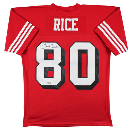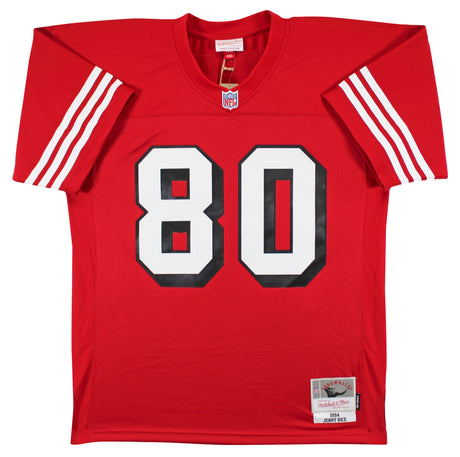 49ers Jerry Rice Signed Red M&N Jersey w/ Dropshadow Fanatics #QL84398928