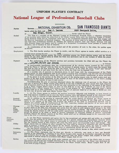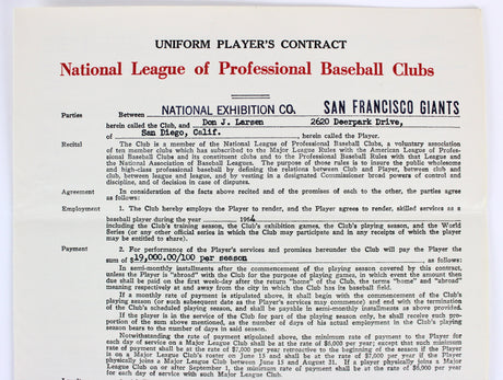 Don Larsen Signed 1964 San Francisco Giants Uniform Player's Contract BAS LOA