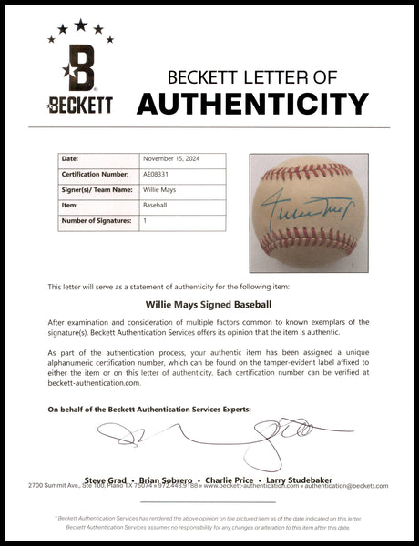 Willie Mays Autographed Official NL Baseball San Francisco Giants Beckett BAS #AE08331