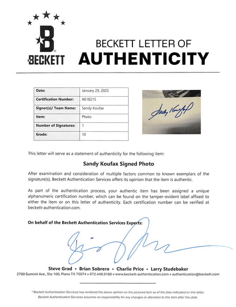 Sandy Koufax Autographed Framed 8x10 Photo Los Angeles Dodgers Beckett BAS #AE08256