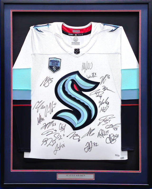 This Framed White Adidas Seattle Kraken Jersey is a must-have for hockey fans and collectors, celebrating the team’s historic 2021-22 Inaugural Season. Measuring approximately 31x36 inches with the frame, this limited-edition piece has been hand-signed by 24 members of the franchise’s first-ever roster, making it a unique and valuable memorabilia item. Key Features: