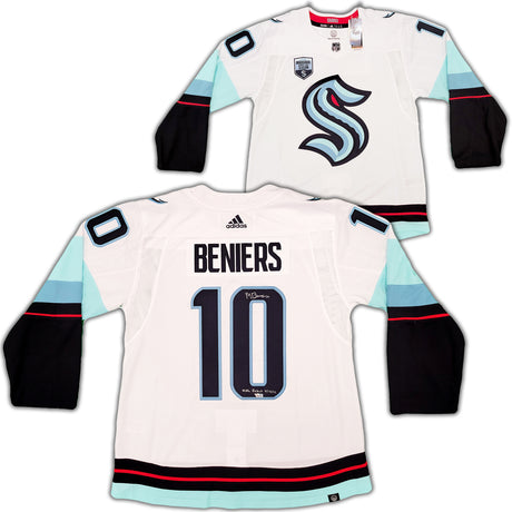 MATT BENIERS Autographed/Inscribed "NHL Debut 4/12/22" Seattle Kraken White Adidas Jersey FANATICS