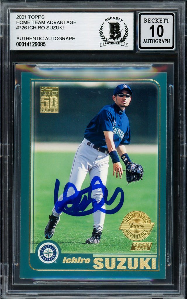 Own a piece of baseball history with this 2001 Topps Home Team Advantage Rookie Card #726, hand-signed by Ichiro Suzuki—one of the most iconic hitters in MLB history. This rare collectible has been graded a Gem Mint 10 for signature quality by Beckett BAS, ensuring top-tier authenticity and condition. Certified authentic by Beckett Authentication Services (BAS), it comes encapsulated in their tamper-proof holder for long-term protection and display.