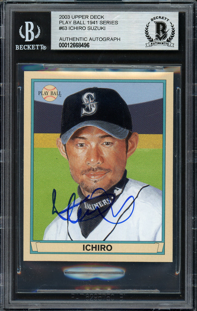 Own a piece of baseball history with this 2003 Upper Deck Play Ball Mini Card #63, hand-signed by Ichiro Suzuki—one of the most legendary hitters in MLB history. This rare collectible has been certified authentic by Beckett Authentication Services (BAS) and comes encapsulated in their tamper-proof holder, ensuring its protection for years to come.