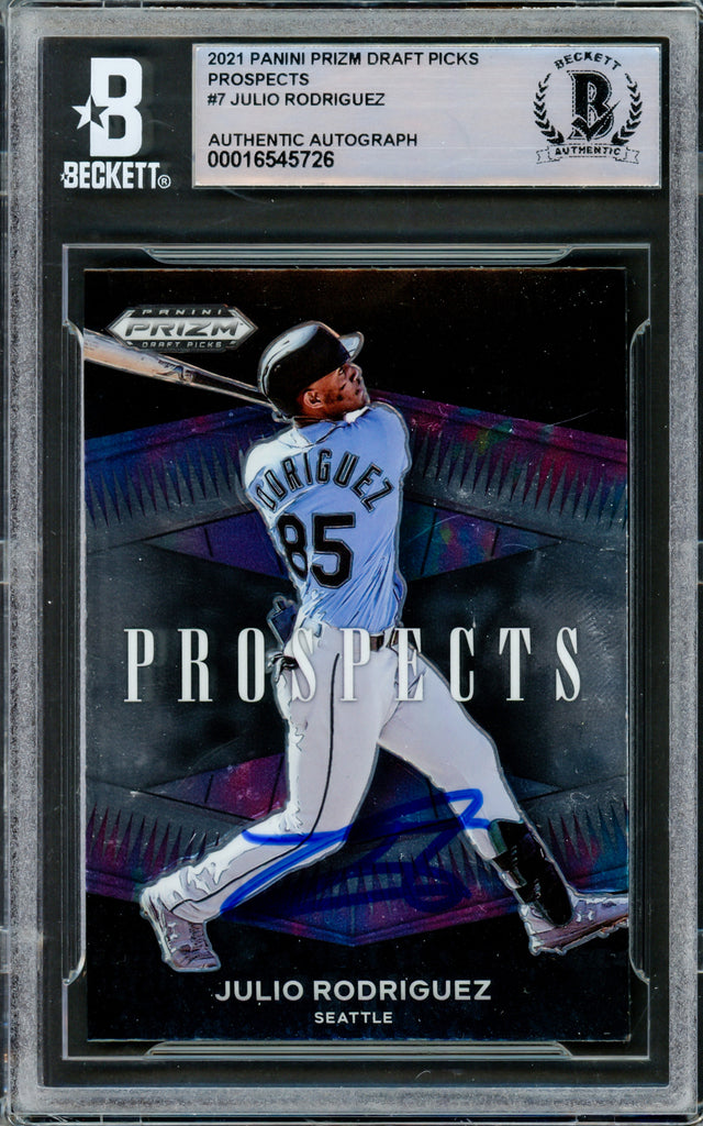 Julio Rodriguez Autographed 2021 Panini Prizm Prospects Rookie Card #P-JR Seattle Mariners Beckett BAS #16545726 is backordered and will ship as soon as it is back in stock.
