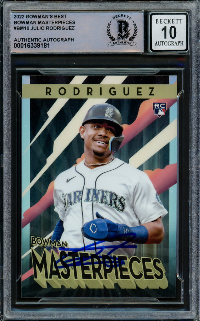 Own a piece of baseball history with this 2022 Bowman's Best Masterpieces Rookie Card #BM-10, hand-signed by rising Seattle Mariners star Julio Rodríguez. A must-have for serious collectors, this rare rookie card features a Gem Mint 10 signature grade from Beckett Authentication Services (BAS), ensuring its pristine condition and authenticity. Encapsulated in BAS’s tamper-proof holder, this card is protected for long-term preservation.