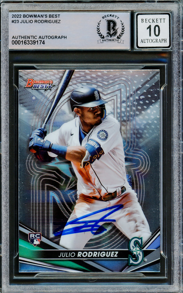 Own a piece of baseball history with this 2022 Bowman's Best Rookie Card #23, personally hand-signed by Julio Rodríguez. This stunning collectible has been authenticated by Beckett Authentication Services (BAS) and encapsulated in their tamper-proof holder for lasting protection. The signature itself has been graded Gem Mint 10 by Beckett BAS, ensuring top-tier quality for serious collectors.