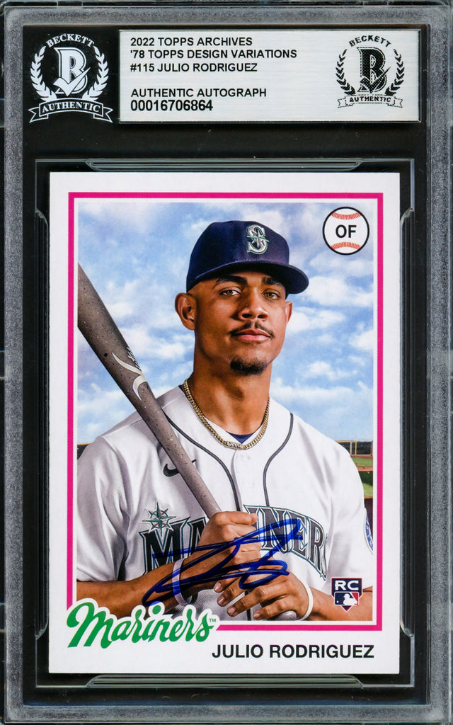 Own a piece of baseball history with this 2022 Topps Archives '78 Design Variations Rookie Card #115, hand-signed by Julio Rodríguez. As one of the most electrifying young stars in Major League Baseball, Rodríguez is making a name for himself, and this rookie card is a must-have for collectors and fans alike. Authenticated by Beckett Authentication Services (BAS), this card is securely encapsulated in their tamper-proof holder to ensure its long-term preservation.