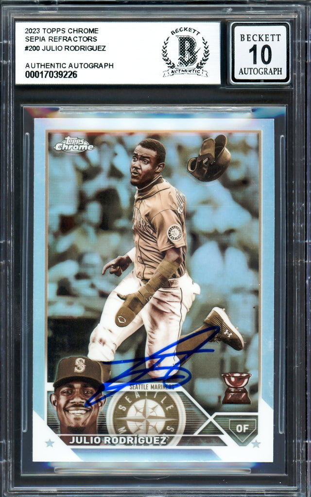 Own a piece of baseball history with this 2023 Topps Chrome Sepia Refractor Card #200, hand-signed by rising MLB superstar Julio Rodríguez. This exclusive collectible has been authenticated and graded for premium quality, making it a must-have for any serious sports memorabilia enthusiast.