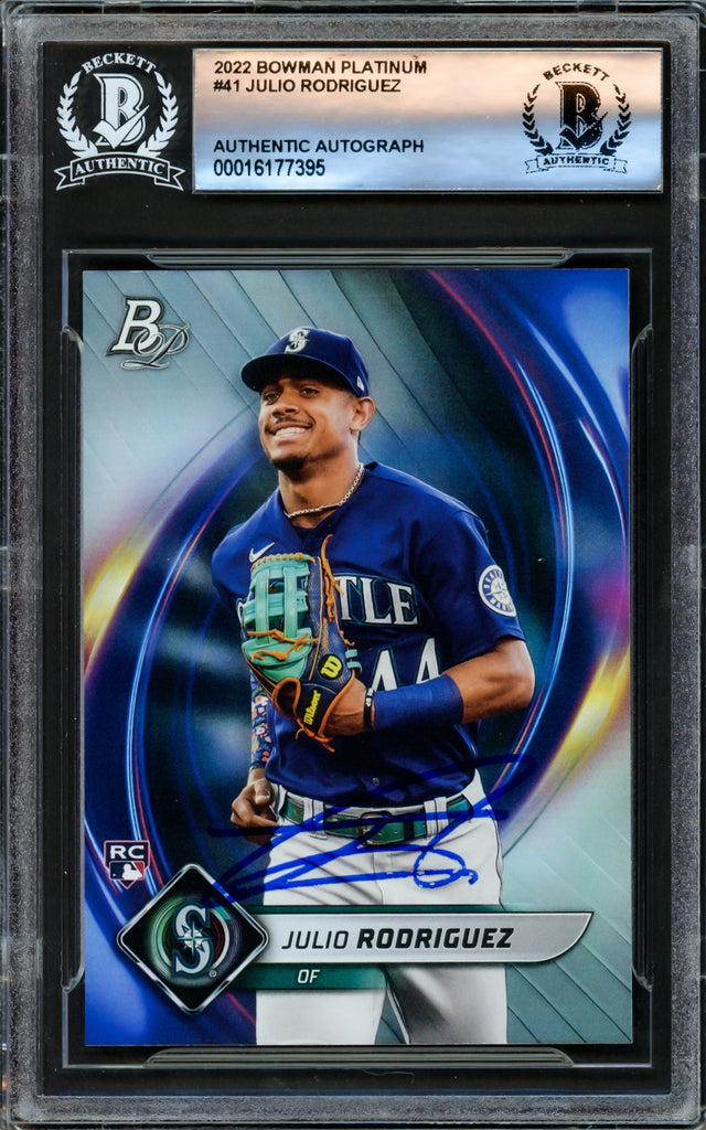 Julio Rodriguez Autographed 2022 Bowman Platinum Rookie Card #41 Seattle Mariners Beckett BAS #16177395 is backordered and will ship as soon as it is back in stock.