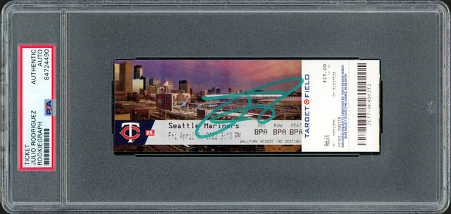 Own a piece of baseball history with this Julio Rodríguez Autographed MLB Debut Ticket! This collectible ticket marks Rodríguez’s Major League Baseball debut on April 8, 2022, when the Seattle Mariners faced the Minnesota Twins. A rising star and one of baseball's most exciting talents, Rodríguez made his mark at Target Field, starting a career destined for greatness.