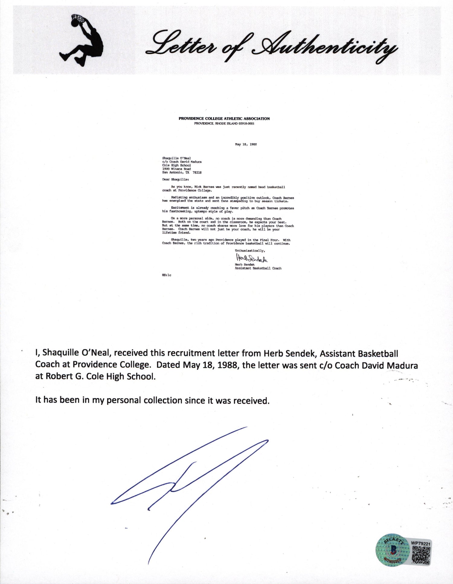 - Original 1988 Providence College recruitment letter written to Shaquille O'Neal