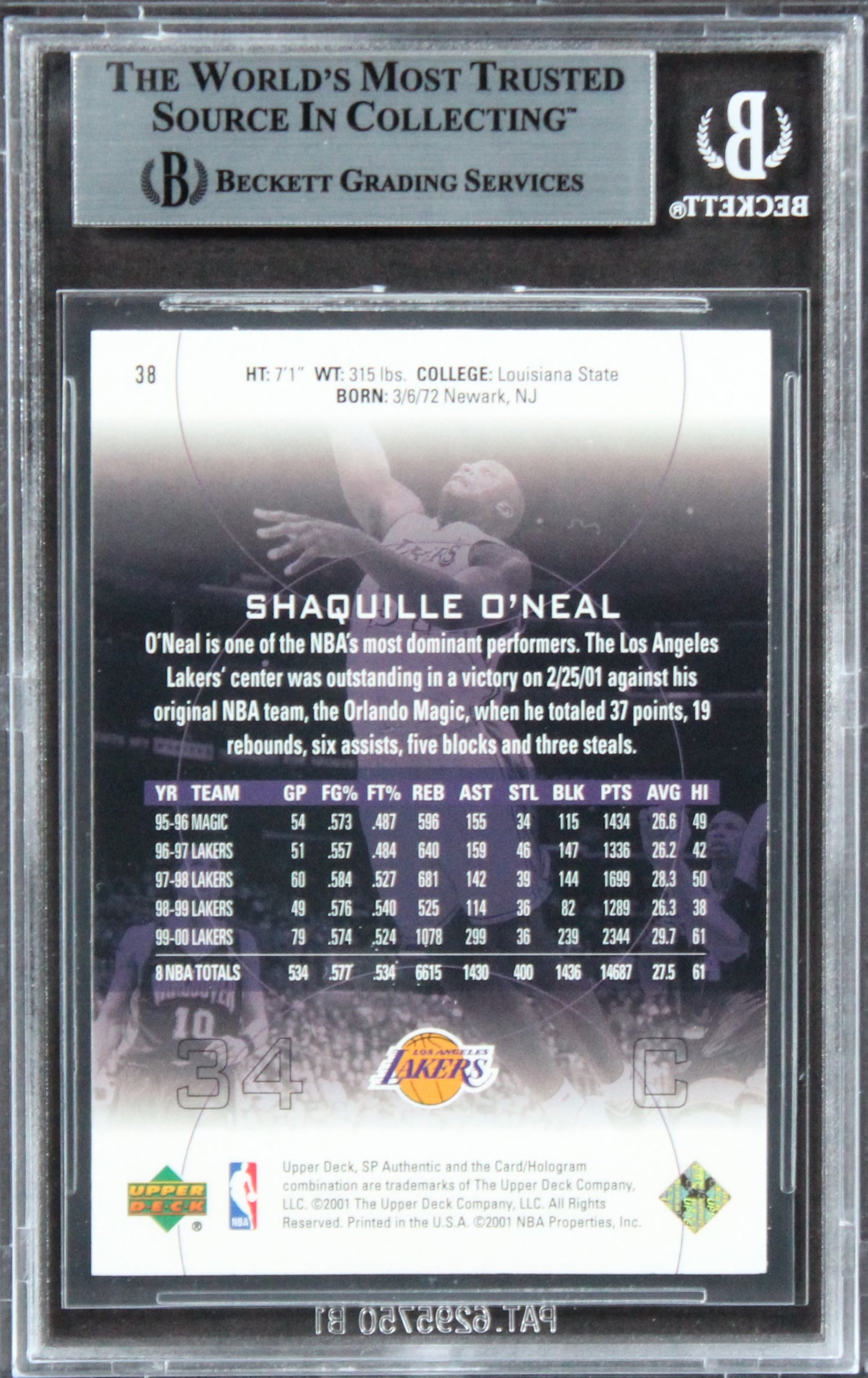 Lakers Shaquille O'Neal Signed 2000 SP Authentic #38 Card BAS Slabbed
