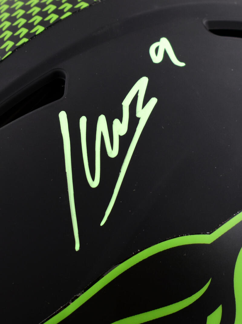 Pay tribute to one of the NFL’s rising stars with this Kenneth Walker III Autographed Seattle Seahawks Full-Size Eclipse Speed Authentic Helmet. This sleek black Riddell helmet with striking green signature is a must-have for any serious Seahawks fan or memorabilia collector. As Seattle’s standout running back, Kenneth Walker III has quickly become a key figure in the team's offensive power—this signed helmet captures a moment in his early professional career and showcases his potential legacy. This autographed helmet is authenticated by Beckett Witnessed Authentication, complete with a tamper-proof hologram sticker and unique QR code that provides instant online verification. Whether you’re expanding your collection or displaying it in your sports room, this piece combines authenticity, style, and collector value.