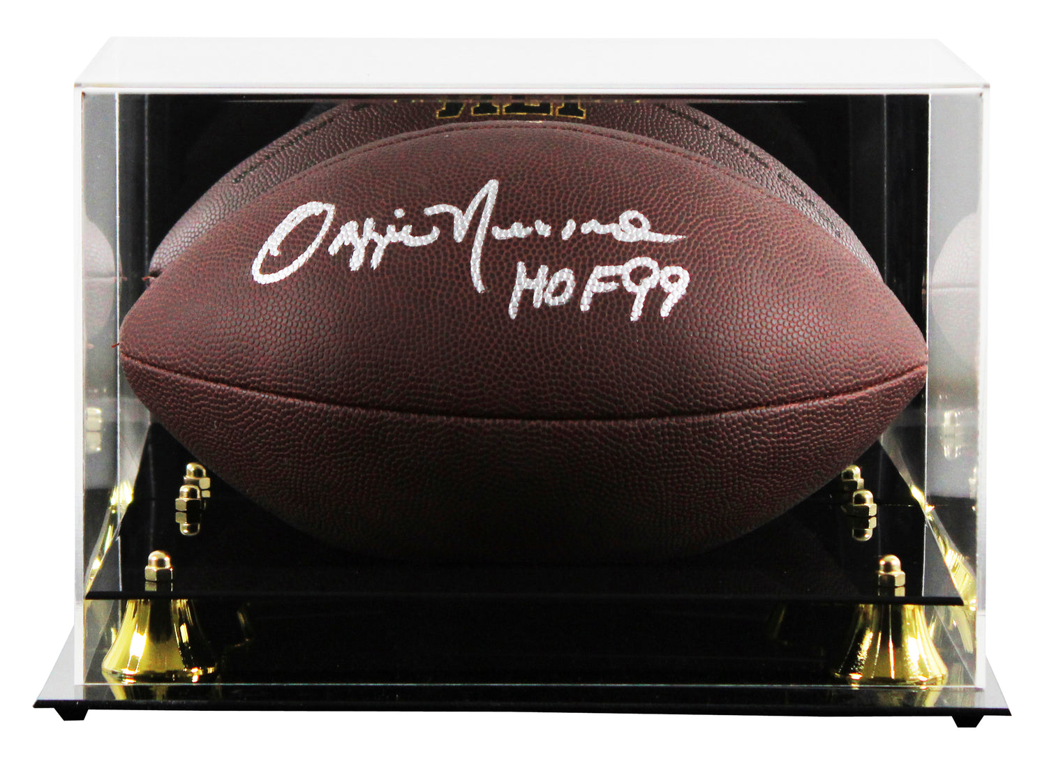 This Autographed Wilson Super Grip Football with UV Mirrored Back Acrylic Display Case is a must-have for any serious collector or fan of the Cleveland Browns. Personally signed by Ozzie Newsome—iconic tight end and Pro Football Hall of Fame inductee—in bold ink with the inscription "HOF 99", this piece captures a historic moment in NFL history. Newsome, a cornerstone of the Browns franchise and a trailblazing GM post-retirement, continues to inspire football fans across generations. Each football is authenticated by Beckett Authentication Services (BAS) and features a tamper-evident BAS sticker with a scannable QR code for instant verification. As part of the BAS Witnessed Protection Program, a Beckett representative was present during the signing, guaranteeing the autograph's authenticity. Please note, Beckett no longer issues paper COA cards—the affixed sticker is the complete form of authentication. Because each item is hand-signed, signature placement and strength may vary slightly, making each piece unique.