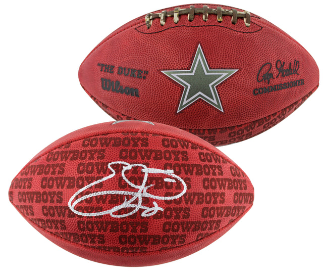 Own a piece of football history with this Autographed Official Wilson "The Duke" Team Showcase NFL Football, personally signed by Emmitt Smith —legendary running back of the Dallas Cowboys. This collectible is a must-have for fans and serious memorabilia collectors alike.