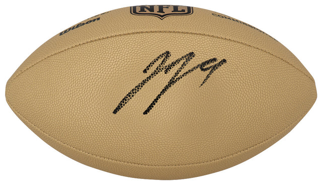 - Authentic J.J. McCarthy autograph on a Wilson Duke gold metallic NFL full-size replica football