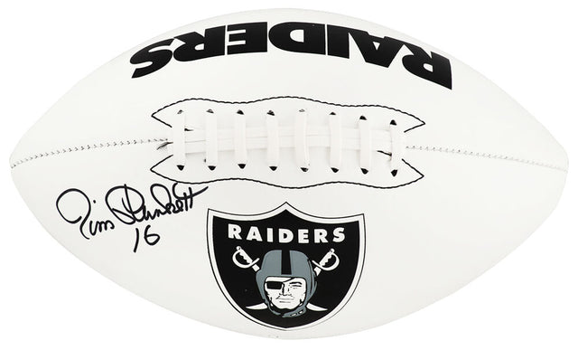 Own a piece of football history with this Jim Plunkett signed Raiders Franklin white logo full size football—a must-have collectible for die-hard fans of the Silver and Black. Jim Plunkett, a legendary quarterback and the only Latino QB to win two Super Bowl titles, led the Raiders to victory in Super Bowl XV and Super Bowl XVIII. This high-quality full-size white panel football is perfect for display and pays tribute to one of the greatest moments in Raiders history.