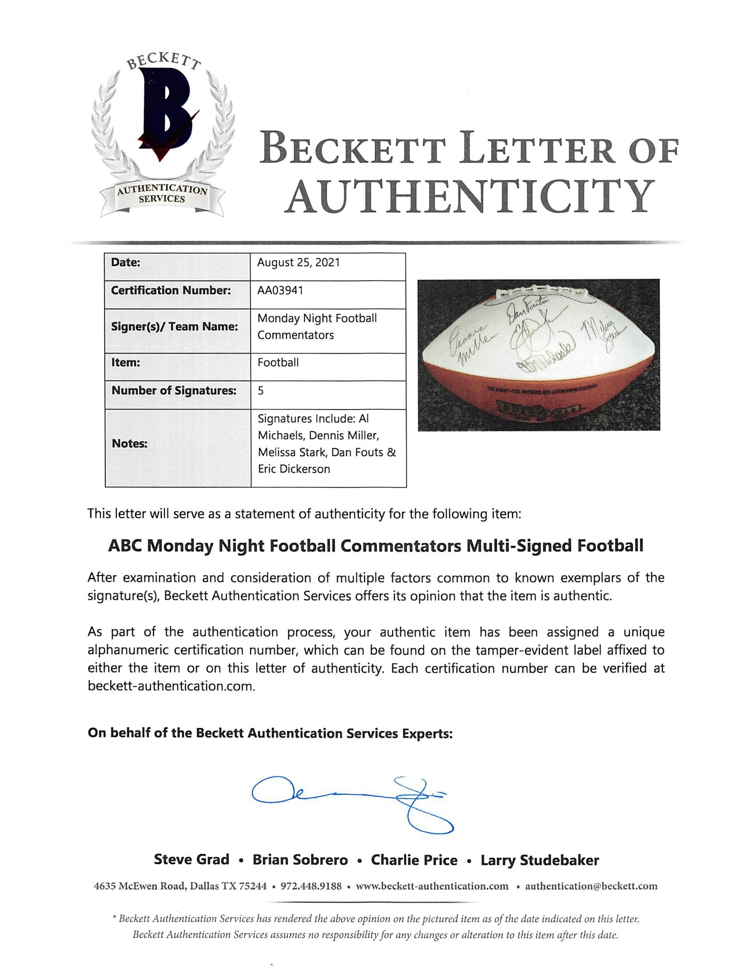 MNF (5) Michaels, Miller, Stark +2 Signed White Panel Nfl Football BAS #AA03941