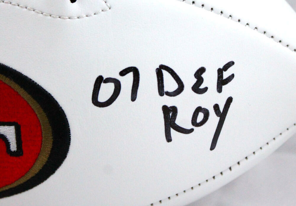 This Patrick Willis autographed San Francisco 49ers logo football is a must-have for die-hard 49ers fans and serious memorabilia collectors. Celebrating one of the greatest defensive players in franchise history, this exclusive piece features Willis’s hand-signed autograph along with a rare "07 DEF POY" inscription, commemorating his 2007 Defensive Player of the Year award-winning season.