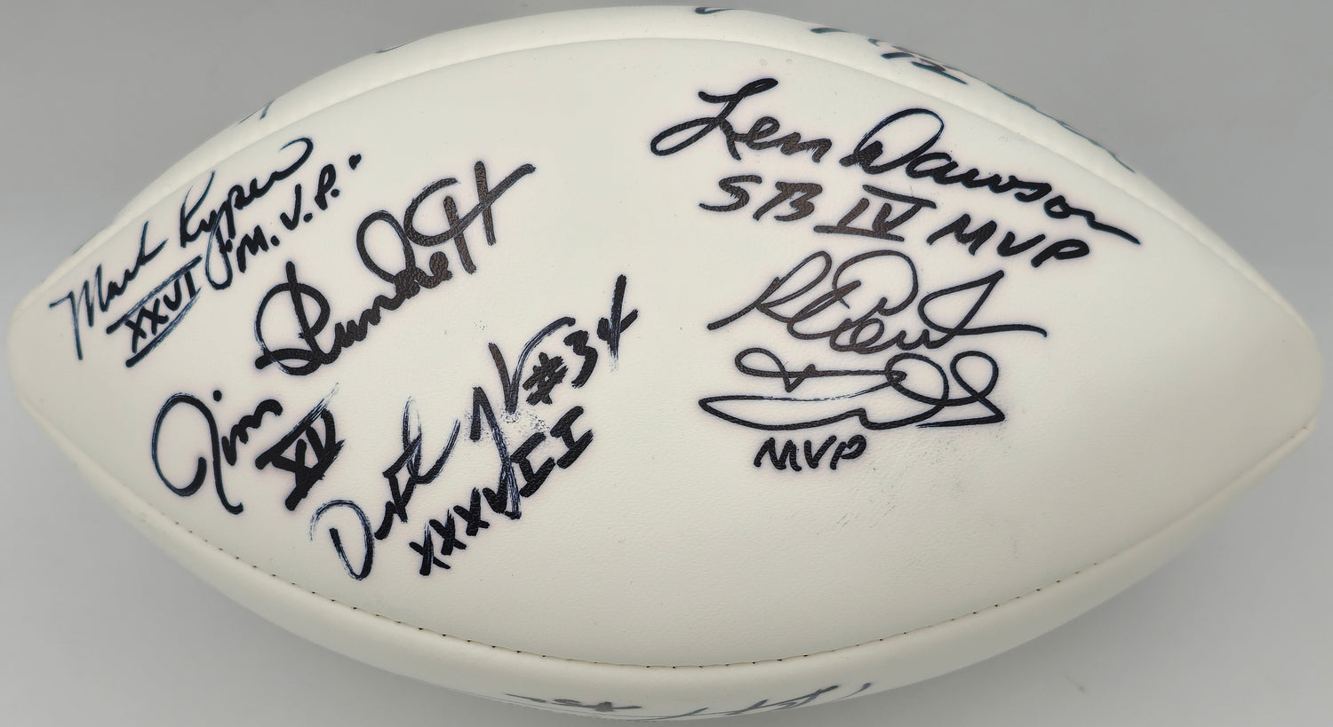 This White Wilson NFL Football is a rare collector’s item, hand-signed by legendary Super Bowl MVPs from across the decades. Featuring autographs from Chuck Howley, Joe Namath, Fred Biletnikoff, Len Dawson, Richard Dent, Ray Lewis, Randy White, Steve Young, Desmond Howard, Jim Plunkett, Phil Simms, Harvey Martin, Deion Branch, Larry Brown, Dexter Jackson, and Mark Rypien, this football is a must-have for any serious NFL collector or football fan.