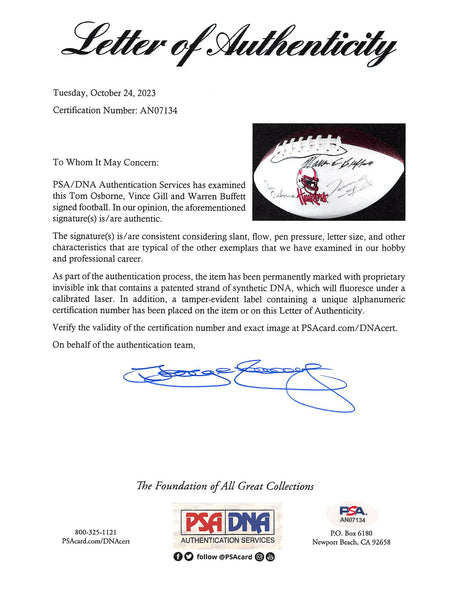 Warren Buffett, Tom Osborne & VInce Gill Signed White Panel Logo Football PSA