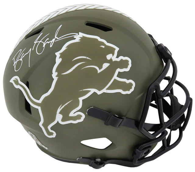 Own a piece of football history with this Barry Sanders signed Detroit Lions Salute to Service Riddell Speed full-size replica helmet. A tribute to both one of the greatest running backs in NFL history and the men and women who serve our country, this collectible is a must-have for Lions fans and memorabilia enthusiasts.