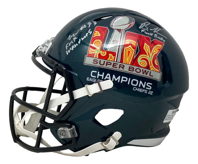 Own a piece of Philadelphia Eagles history with this Brandon Graham & Milton Williams signed full-size replica Speed helmet—a must-have for die-hard Eagles fans and memorabilia collectors. This unique collectible features bold autographs from Super Bowl LII hero Brandon Graham and rising star Milton Williams, each inscribed with their personal messages—"F* Brady" (Graham) and "F* Mahomes" (Williams)—adding an edgy touch that reflects their competitive spirit.