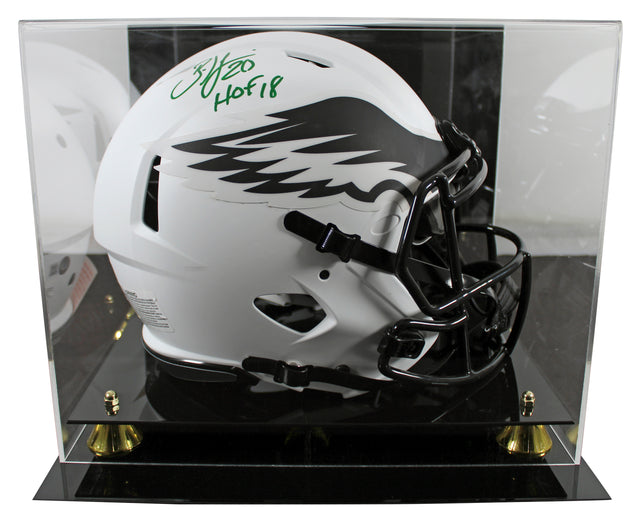 Own a piece of Philadelphia Eagles history with this Autographed Alternate Lunar Riddell Full-Size Speed Proline Helmet personally signed by Brian Dawkins. This exclusive collectible includes the "HOF 18" inscription, celebrating Dawkins' induction into the Pro Football Hall of Fame in 2018. The helmet comes with a UV Mirrored Back Acrylic Display Case, making it a stunning showcase piece for any Eagles fan or memorabilia collector.