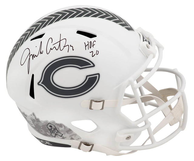 Enhance your collection with this Jim Covert signed Chicago Bears 2024 Salute White Riddell Full-Size Speed Replica Helmet, a must-have for any dedicated Bears fan. This stunning piece features Covert’s signature along with the "HOF 20" inscription, commemorating his induction into the Pro Football Hall of Fame.
