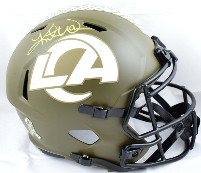 Own a piece of NFL history with this Kurt Warner hand-signed Riddell Salute to Service Speed full-size replica helmet. A legendary quarterback for the St. Louis Rams, Warner led the team to a Super Bowl XXXIV victory and earned two NFL MVP awards, securing his place as one of the greatest to ever play the game.