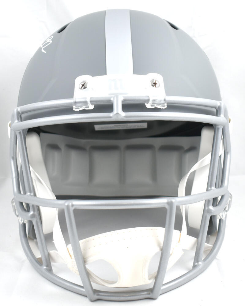 Own a piece of football history with this hand-signed Michael Strahan New York Giants Riddell Full-Size Slate Speed Replica Helmet. A legendary defensive end, Michael Strahan helped lead the New York Giants to victory in Super Bowl XLII and is a Hall of Famer known for his record-breaking sacks. This autographed helmet is a must-have for any dedicated Giants fan or serious memorabilia collector.