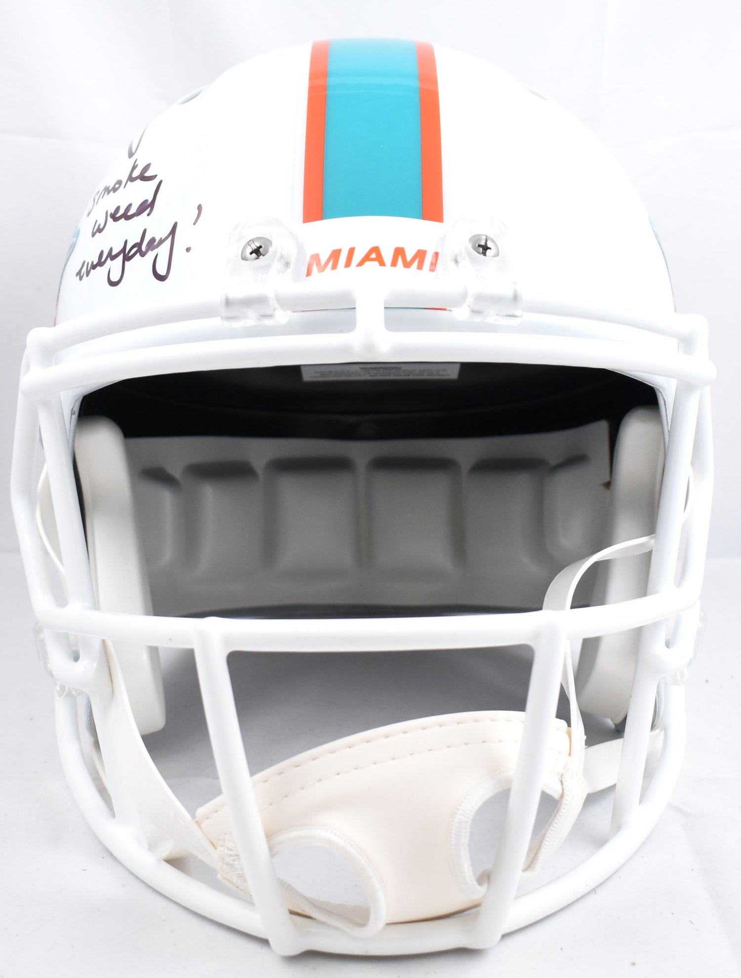 Own a legendary piece of football history with this Ricky Williams Autographed Riddell Full-Size Speed Replica Helmet, featuring a bold inscription: “Smoke Weed Everyday”. A standout NFL running back, Ricky Williams made headlines both on and off the field during his dynamic career with the Miami Dolphins. This signed helmet is a must-have for serious fans and collectors who appreciate both the cultural impact and athletic legacy of Ricky Williams.