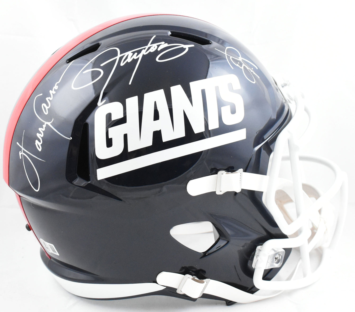 - Autographed by New York Giants legends Lawrence Taylor, Harry Carson, and Phil Simms — three franchise icons and Super Bowl XXI champions