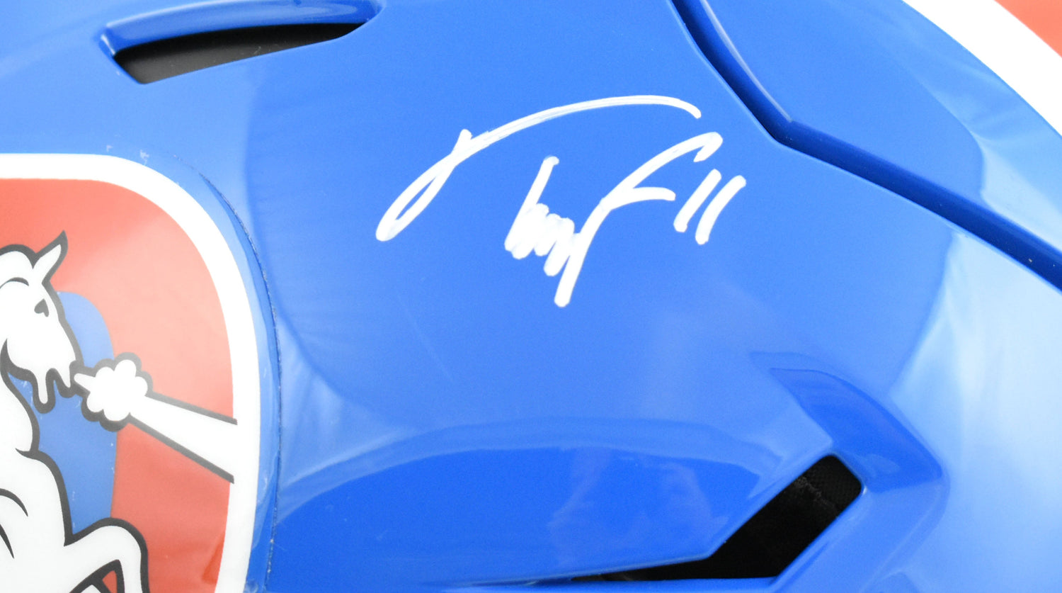 Own a piece of Denver Broncos history with this autographed Troy Franklin Riddell Speed Flex Authentic full-size helmet, signed by the rising wide receiver who’s poised to leave a lasting mark on the franchise. This is a must-have for any serious NFL memorabilia collector or devoted Broncos fan. This helmet is not only a stunning display piece—it's also backed by top-tier authentication for your peace of mind.