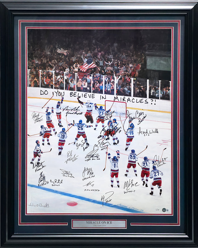 Celebrate one of the most iconic moments in sports history with this Framed 22x30 Signed Photo by the 1980 Team USA Hockey Team, measuring approximately 30x37 inches with the frame. This exclusive, limited edition collectible captures the spirit of the "Miracle on Ice"—a triumphant victory over the Soviet Union at the 1980 Winter Olympics in Lake Placid that inspired a nation. Featuring original autographs from the legendary players who defied all odds, this piece is a must-have for serious collectors and Olympic sports fans alike.