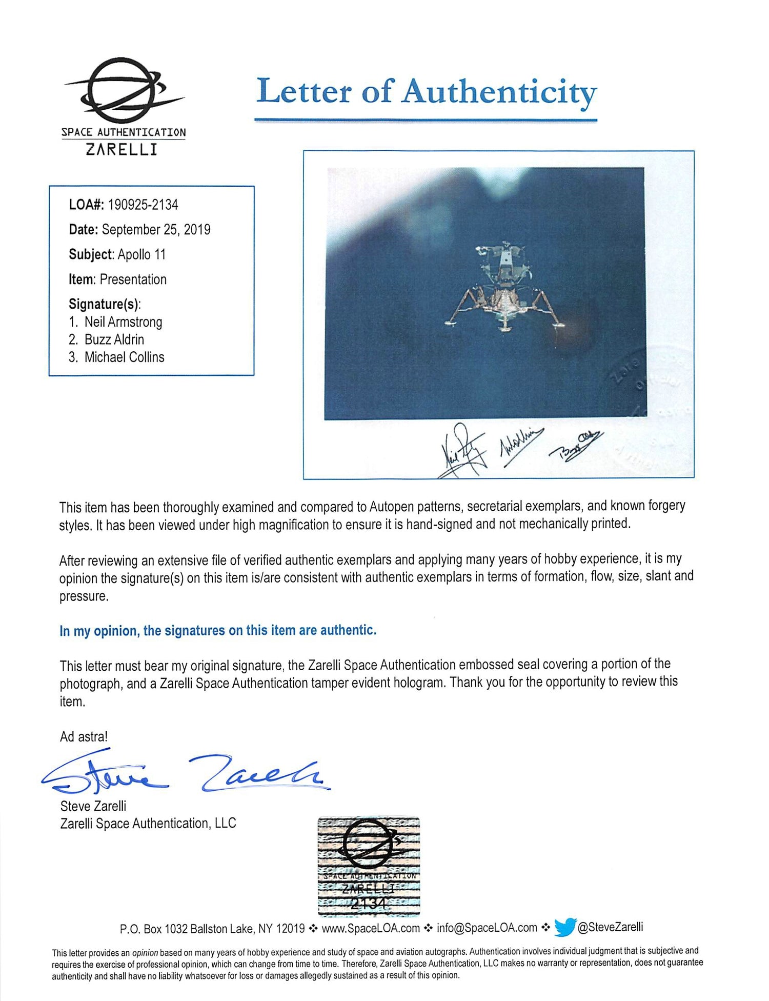 - 100% Authentic Signatures – Personally signed by Neil Armstrong, Buzz Aldrin, and Michael Collins on the matting below the photo.