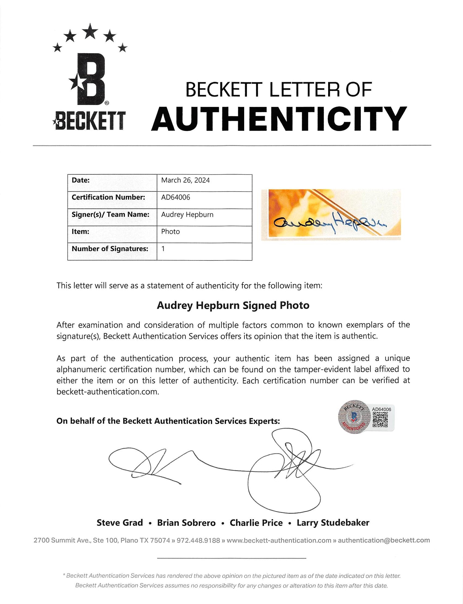 - Authenticity Guaranteed: This signed photo includes a Certificate of Authenticity (COA) and hologram from Beckett Authentication Services, ensuring 100% authenticity.