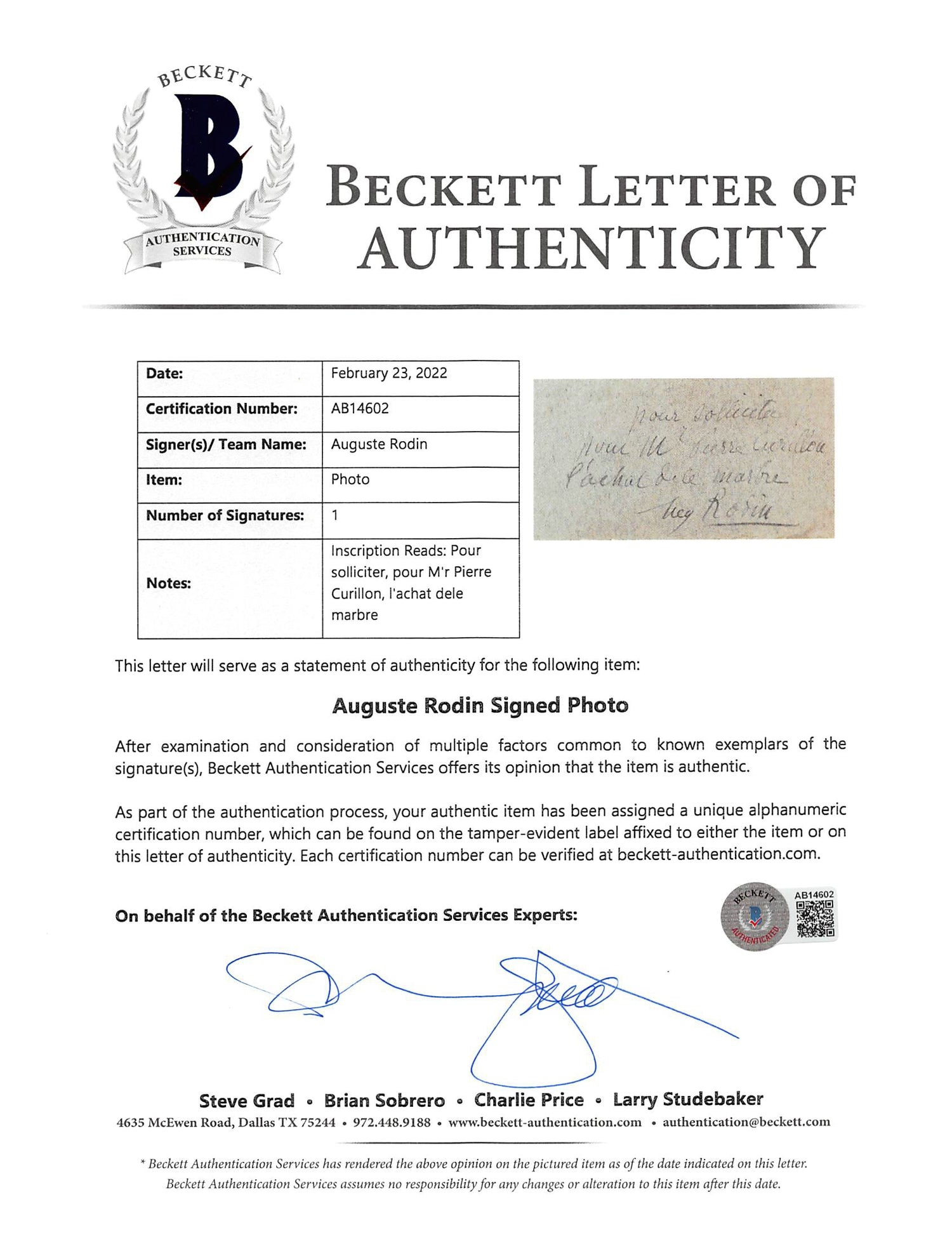 Auguste Rodin "Pour solliciter" Authentic Signed Matted 6.25x9 Photo BAS is backordered and will ship as soon as it is back in stock.