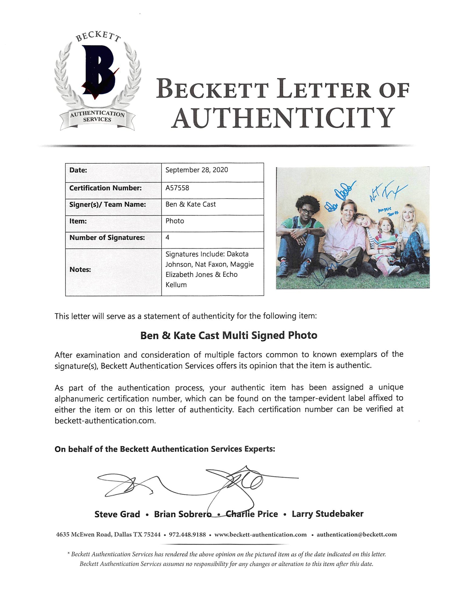Ben & Kate (4) Johnson, Faxon, Jones & Kellum Signed 11x14 Photo BAS #A57558 is backordered and will ship as soon as it is back in stock.