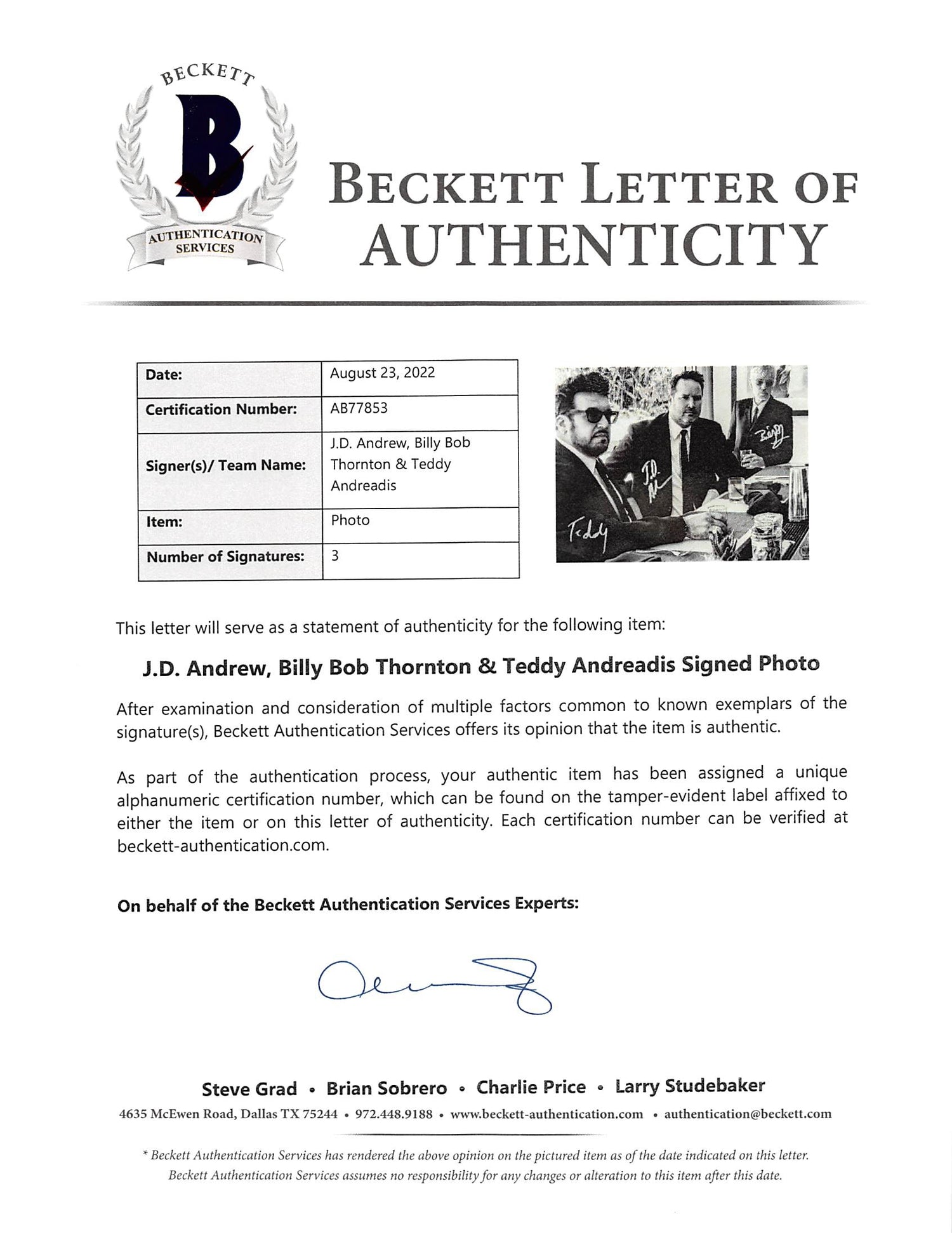 Own a piece of music history with this Autographed 8.5x11 Black & White Photo, personally signed by J.D. Andrew, Billy Bob Thornton, and Teddy Andreadis of The Boxmasters. A must-have for collectors and fans, this rare memorabilia item celebrates the legacy of the renowned rockabilly band, co-founded by Academy Award-winning actor Billy Bob Thornton.