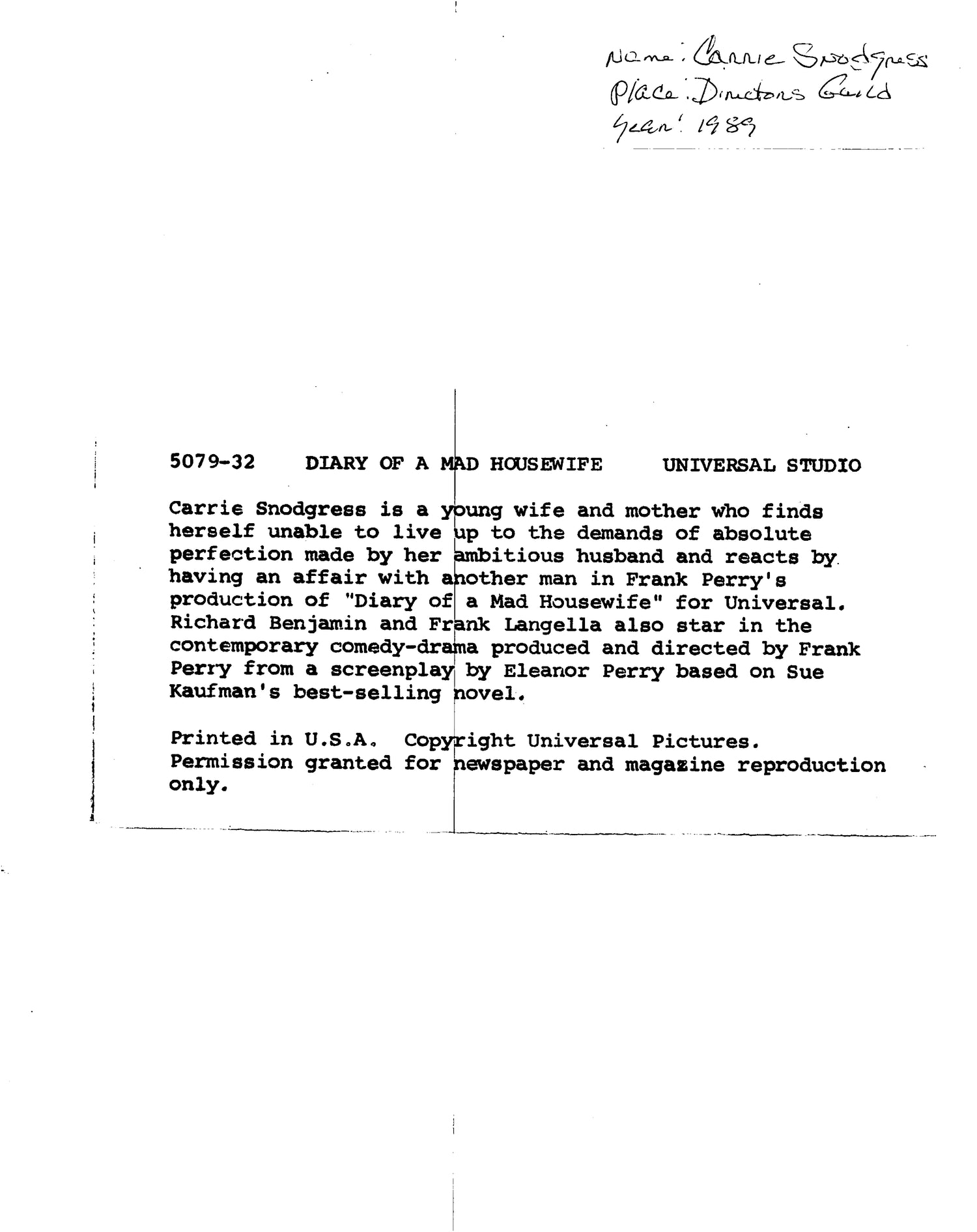 Own a piece of Hollywood history with this autographed 8x10 photo, personally signed by Carrie Snodgress, the acclaimed star of Diary of a Mad Housewife. A must-have for classic film enthusiasts and memorabilia collectors, this rare signed photo captures an iconic moment in cinema.