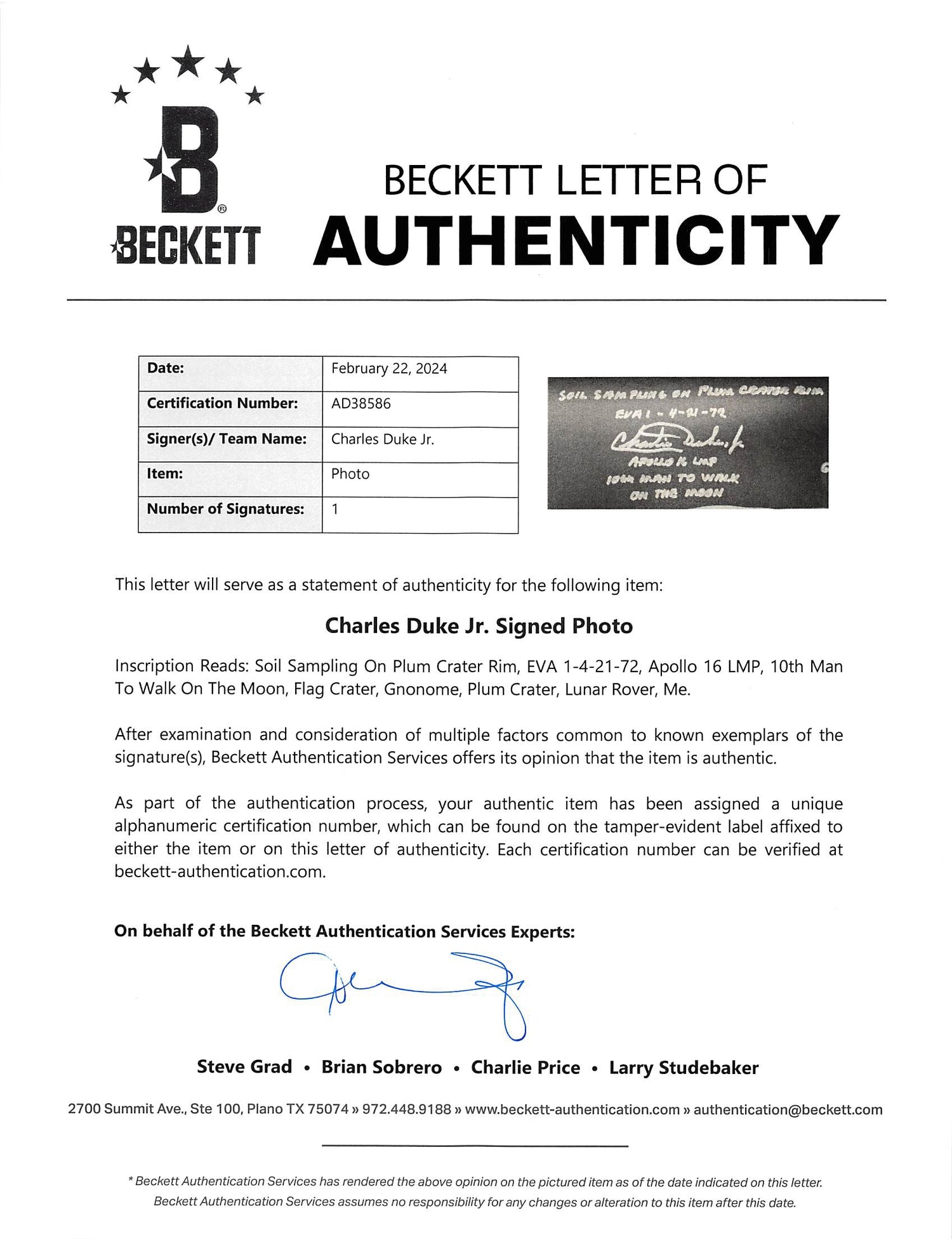 - Authentic Signature & Inscription – Personally signed by Charles Duke, Apollo 16 astronaut.