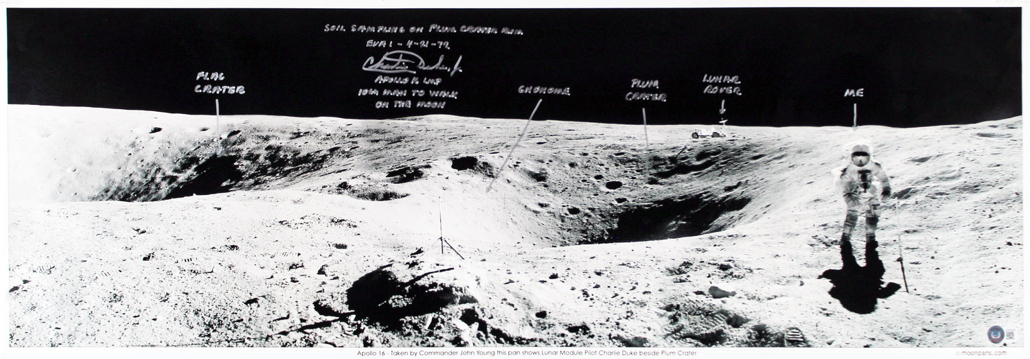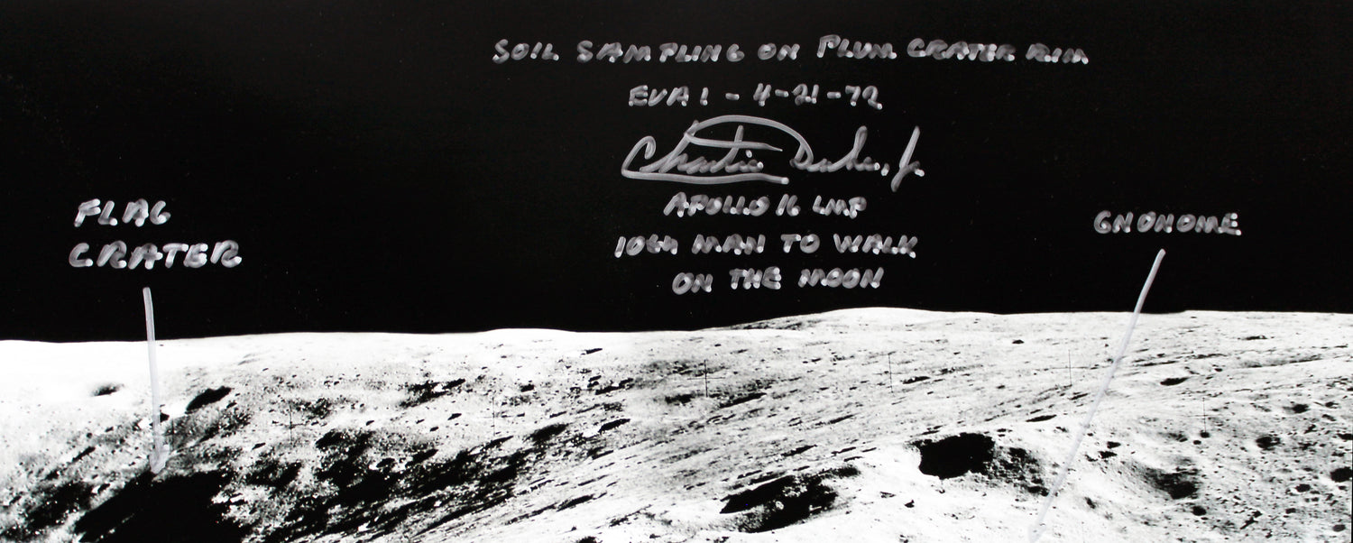 Own a piece of space history with this Autographed 12x35 Photo personally signed by Charles Duke, the Apollo 16 Lunar Module Pilot and the 10th man to walk on the Moon. This extraordinary collectible includes Duke's handwritten inscription detailing his April 21, 1972, EVA (Extravehicular Activity) near Plum Crater, capturing a historic moment from the Apollo 16 mission.