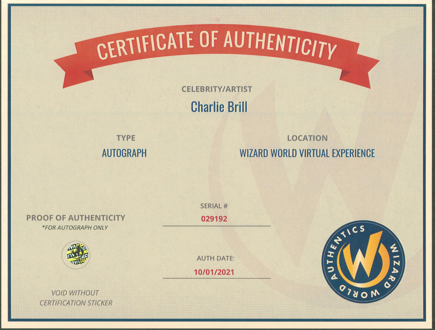 - Personally Signed – Charlie Brill’s signature was obtained in person, with a Wizard World Authentics representative present to verify authenticity.